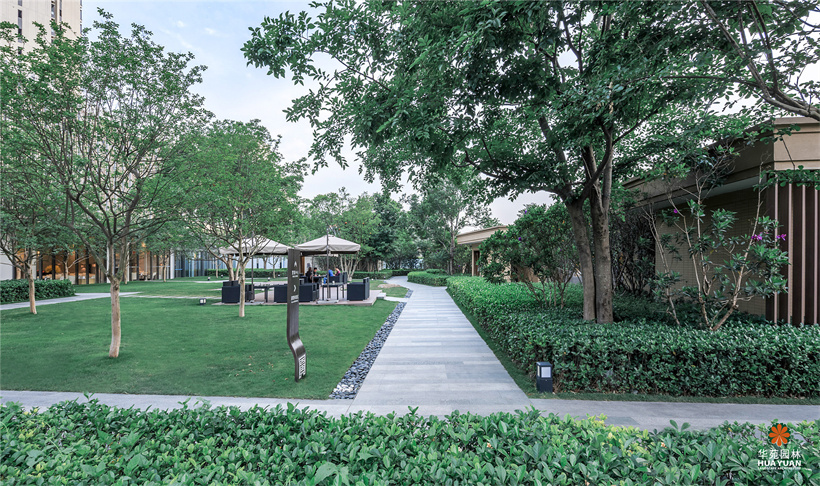 榮獲廣州市城市綠化協(xié)會“2016-2017年度廣州市園林綠化優(yōu)良樣板工程金獎” 華潤置地于廣州的首座集別墅、洋房、LOFT和商業(yè)街區(qū)為一體的高端項目。不同灰度的線性鋪裝與鑲嵌式異形鏡面水景相互映襯,不規(guī)則樹池上,點綴著冠形優(yōu)美的喬木,與躍動的涌泉、蕩漾的漣漪,為空間增添了不少靈動的氣息。開闊的草坪上,冠形勻稱的大喬與精修的灌木相搭配,讓空間更顯開闊、疏朗。