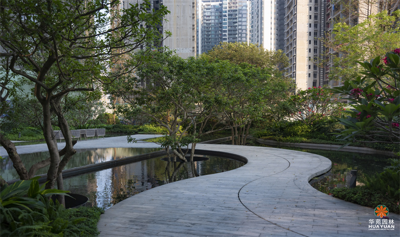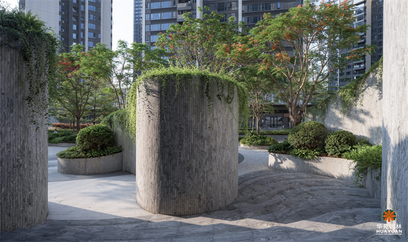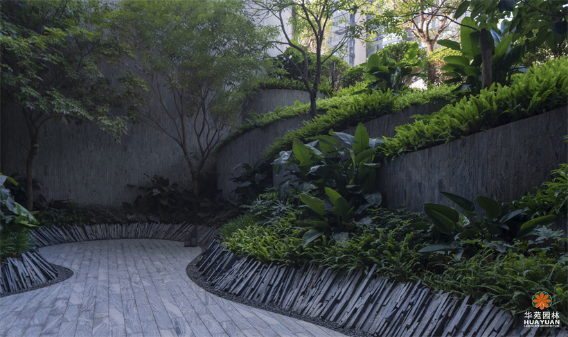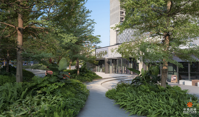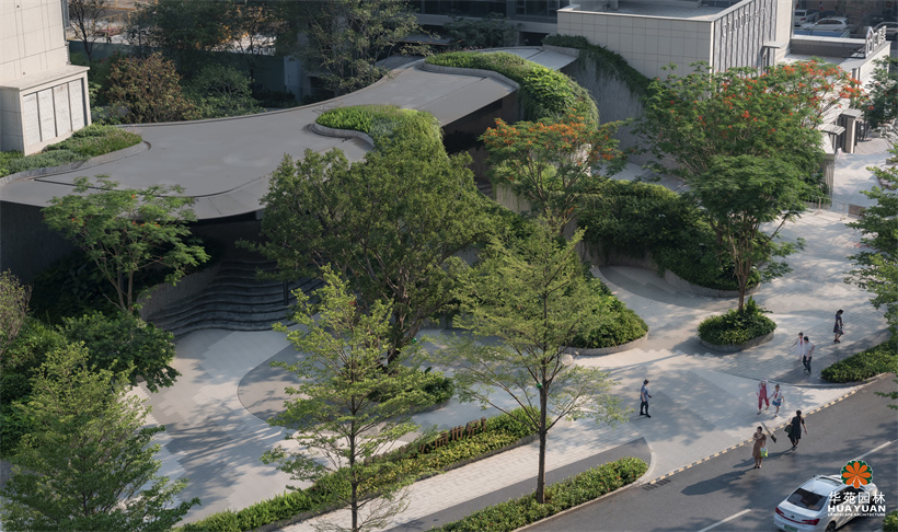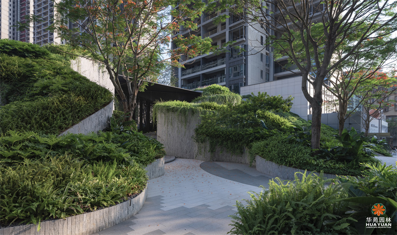 項目特邀世界十佳景觀設(shè)計公司泰國TROP景觀事務(wù)所,以6米挑高弧形門樓,豎向小料石粘貼的曲面花池,及長效低維護的自然花境、自然垂掛的光耀藤,打造兼?zhèn)渚坝^視野和社交場域感的立體公園社區(qū)。