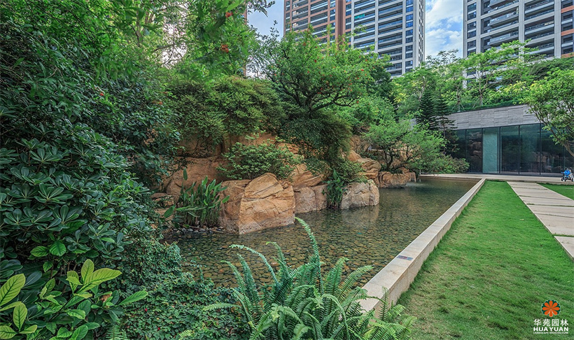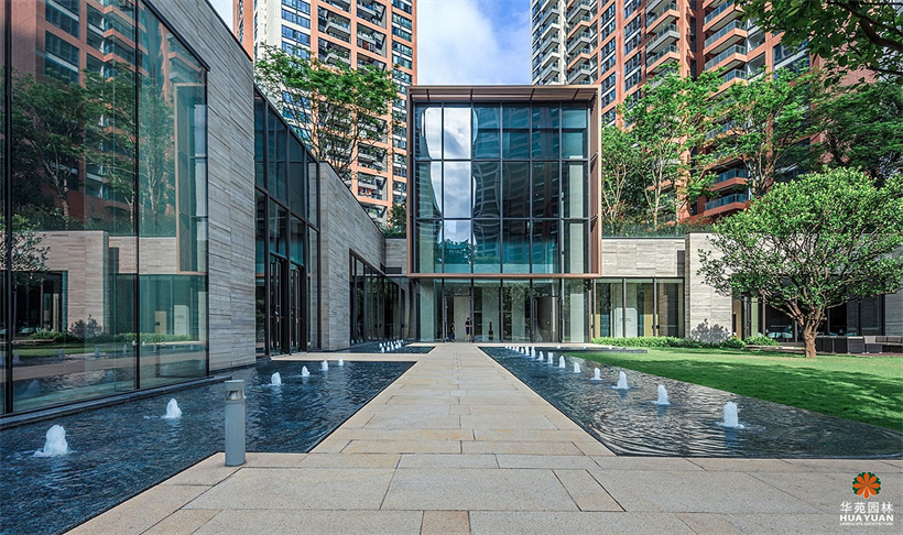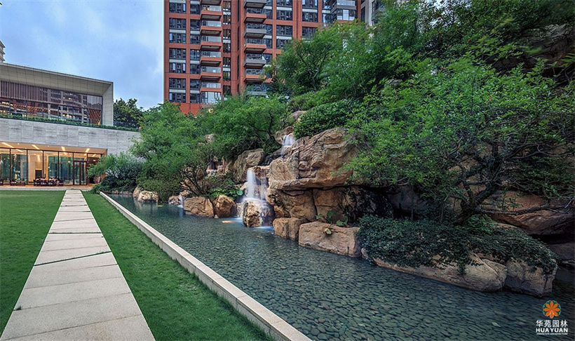 華潤置地打造的城市高端生態(tài)住區(qū)。利用GFRC拓膜技術(shù),高度還原圖紙上7.5米高的塑石假山,再進(jìn)行打磨上色,賦予景石天然的紋路;與繁茂的綠植,潺潺流水,組合出項(xiàng)目特有的銀湖山景。進(jìn)口藍(lán)鉆光面大理石打造的鏡面水景,與園路、草坪置于同一水平面上,形成開敞寬闊的景觀空間。