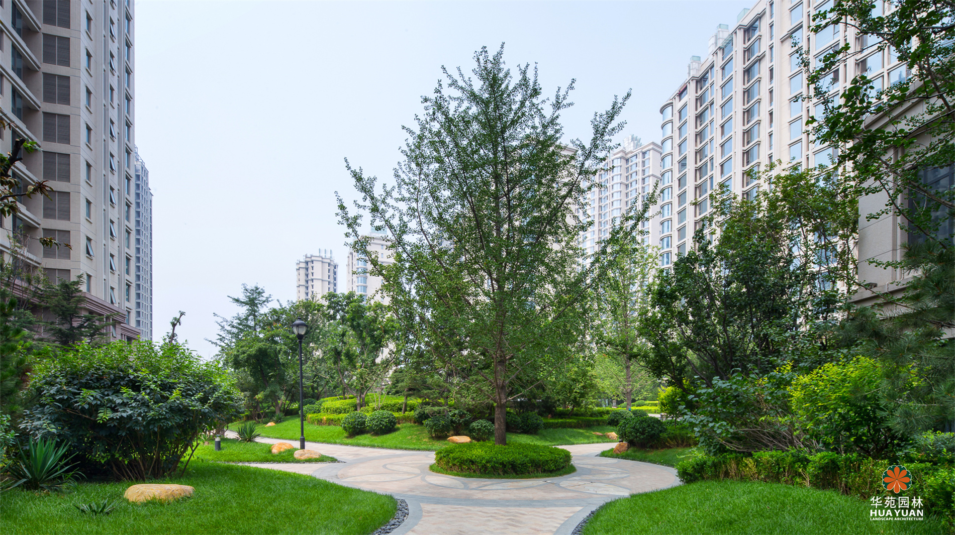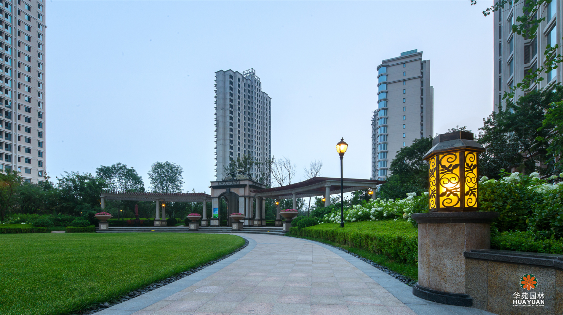 秉承新古典主義園林的設(shè)計(jì)精髓,特色水景、雕塑、高低起伏的草坪等元素與建筑風(fēng)格相互呼應(yīng),形成獨(dú)具特色的感官體驗(yàn)。尤為突出的是在中央景觀的處理上采用中西合璧的混搭手法,并在園區(qū)主景觀軸交匯處營(yíng)造出一個(gè)9萬平米的中央景觀區(qū),讓人聯(lián)想到“天圓地方、包羅萬象”的人文風(fēng)水理念,極具完美的視覺盛宴。