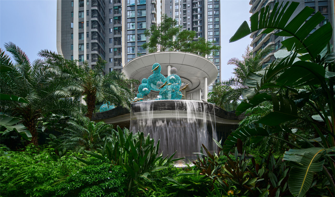 項目顛覆性打造1000平方米的超大鏡面水系以及高達(dá)4米的飛天疊瀑景觀。在水景基礎(chǔ)結(jié)構(gòu)方面,采用抗?jié)B混凝土,于防水砂漿保護(hù)層之上增設(shè)一道防水封閉層,有效阻斷堿性物質(zhì)滲出,從而增強(qiáng)水景的防水性能。
